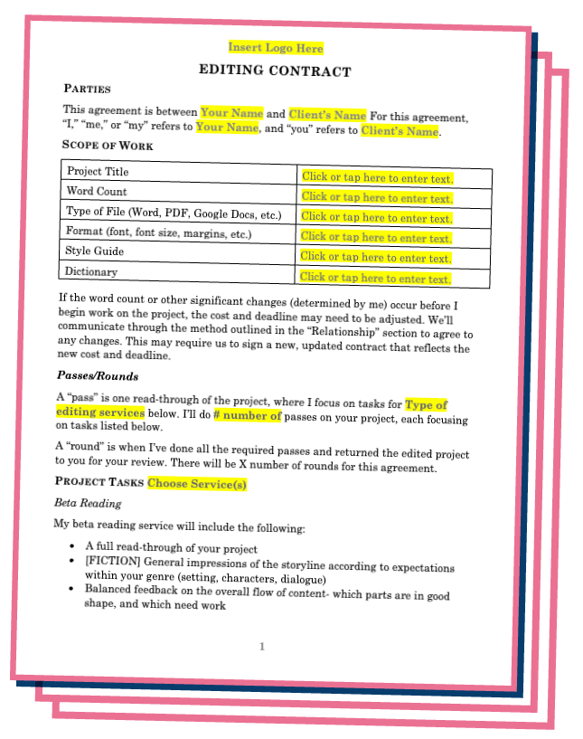 Protect yourself and your clients using this professionally drafted contract (written by an attorney!) specifically for freelance editors, without taking on the hassle or expense of hiring an attorney yourself. The contract covers scope of work, payment terms, generative AI, and more.